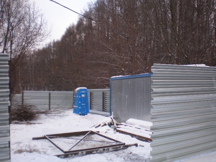 Часть берега речки Химки размером в несколько соток, которая находится у мостика, перед входом в Химкинский лес, неожиданно оказалась огорожена металлическим забором, несколько деревьев внутри - вырублены. Также за заграждением были обнаружены бытовка для рабочих и туалет.