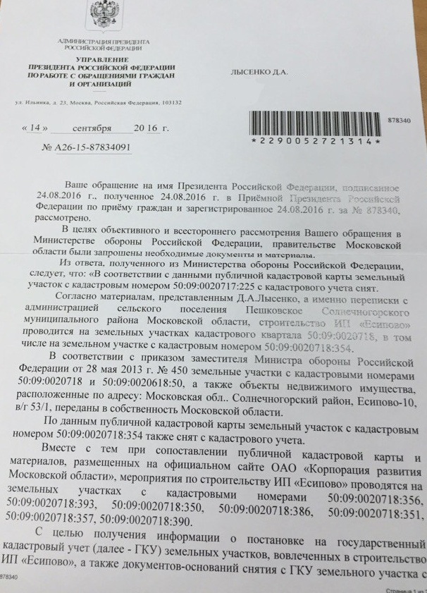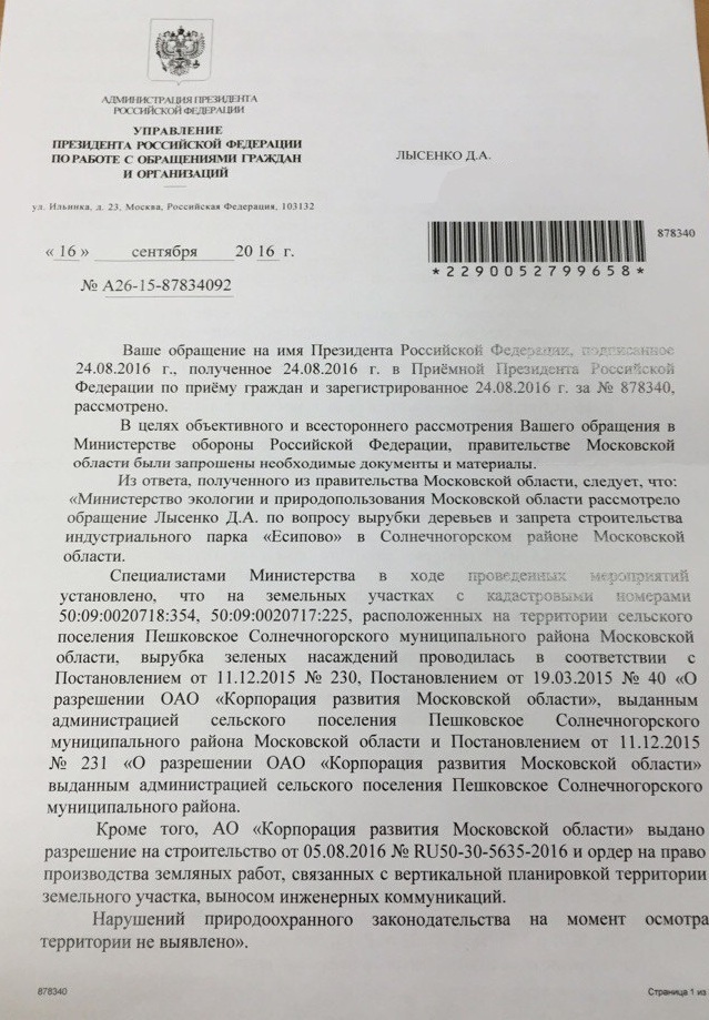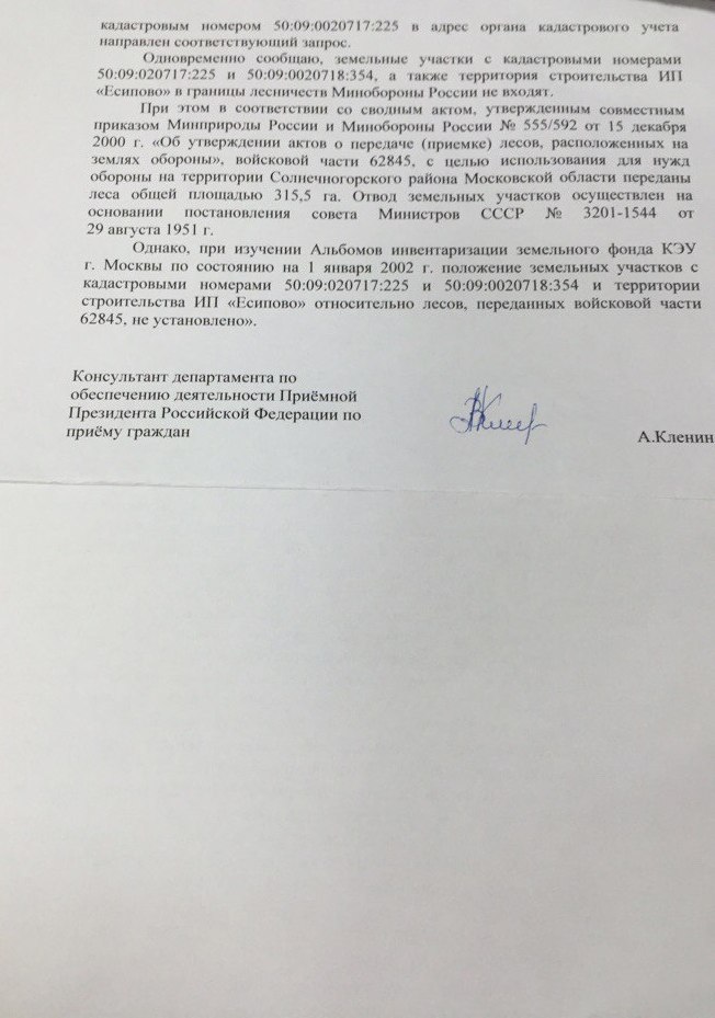 А вот два ответа из Администрации Президента. Первое письмо - о том, насколько законен захват леса под застройку. По правде сказать, этот документ практически не разъясняет странную ситуацию, а только наводит путаницы. Из него невозможно понять, куда же "исчез" огромный кусок леса, который был передан Минобороны РФ во временное пользование для строго определенных целей, а потом должен был вернуться обратно в лесфонд. И как так получилось, что индустриальный парк "Есипово" строится "не в границах" этого леса? И что значит "положение леса не установлено"? Куда же он делся?