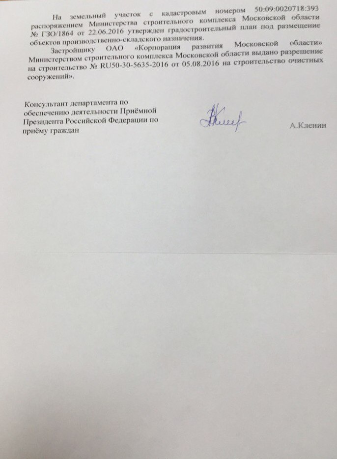 Второй ответ - о том, на основании чего вырублен лес и что собирается строить Корпорация развития Московской области. Утверждается, что Поваровский лес - это якобы вовсе не лес, нарушений при вырубке "зеленых насаждений" (которые не лес) не выявлено, а компенсация за них уже выплачена в бюджет Пешковского поселения. Минстройкомплекс Подмосковья уже подписал ГПЗУ на "промышленно-складские помещения" на вырубке.