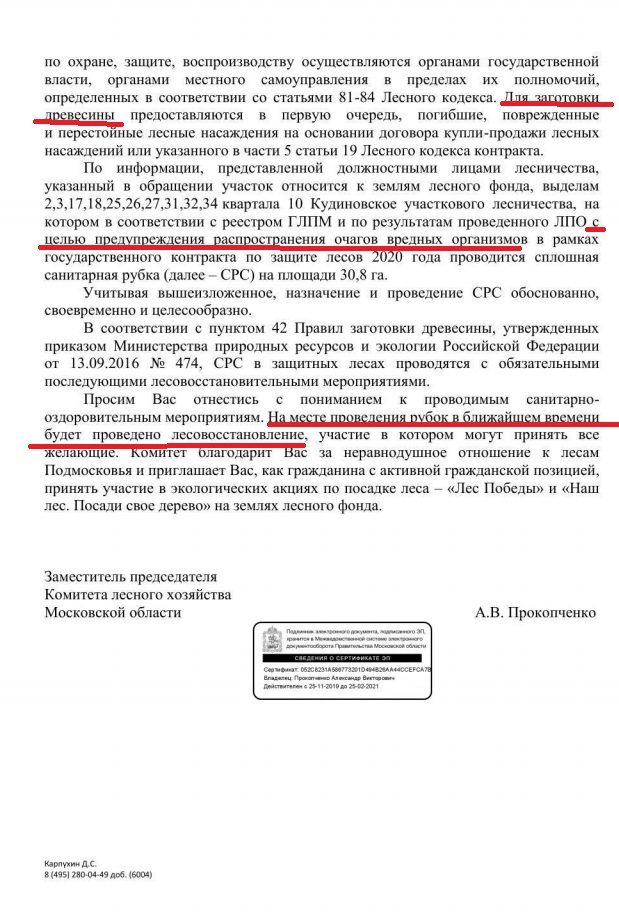 Помимо этого с аккаунта лесхоза в соцсетях пришло разъяснение, согласно которому версия санитарных рубок на 30 гектарах Ногинского лесничества подтверждается и указаны данные по Акту лесопатологического исследования участка.