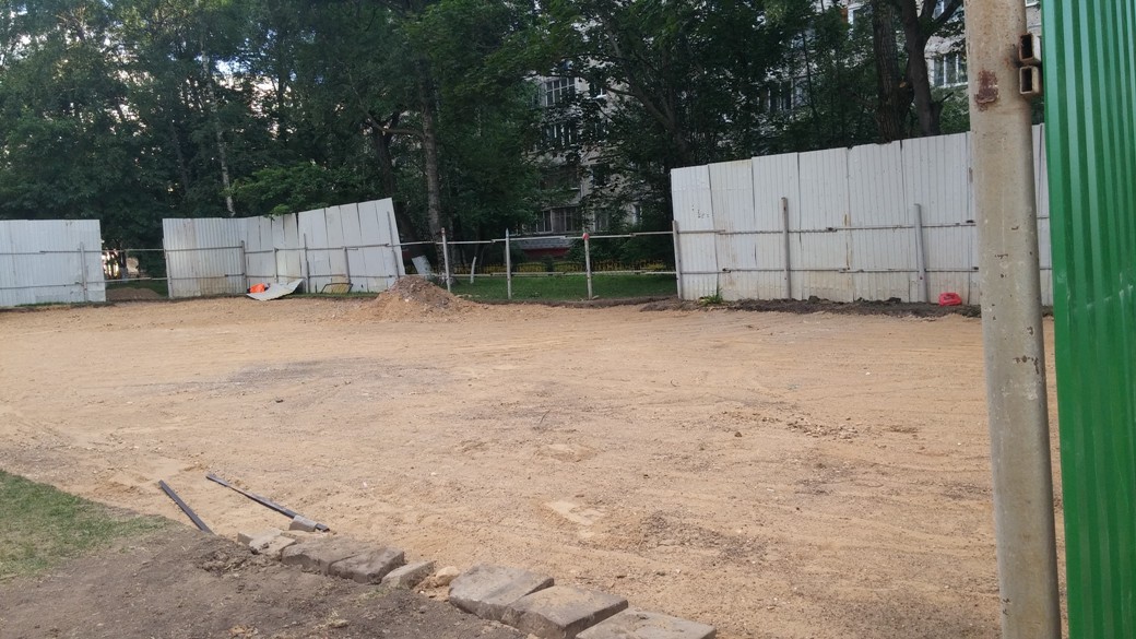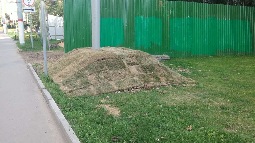 Сейчас на месте бульдозером снята земля, срублено дерево, завезены искусственные газоны - причем трава на них уже засохла, и ее уложили у столба.