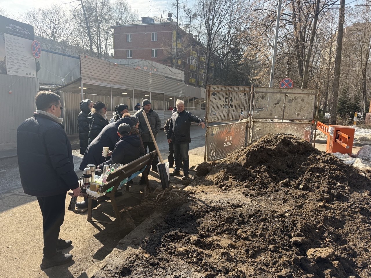 Несколько раз технику удавалось прогнать с места работ на ул. Мосфильмовской, 33. Сергей Митрохин взял лопату и символически засыпал вырытые строителями канавы в знак того, что без согласия граждан на их территорию никто не имеет права претендовать.