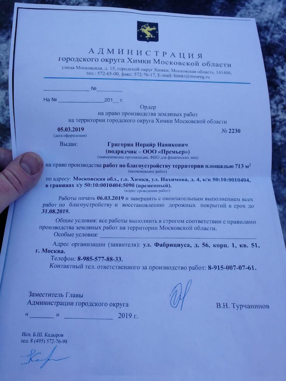 На работы предъявлялся вот такой документ, выданный 5 марта химкинской администрацией. Как мы видим, речь идет о земляных работах и благоустройстве, о вырубке деревьев ничего не написано.