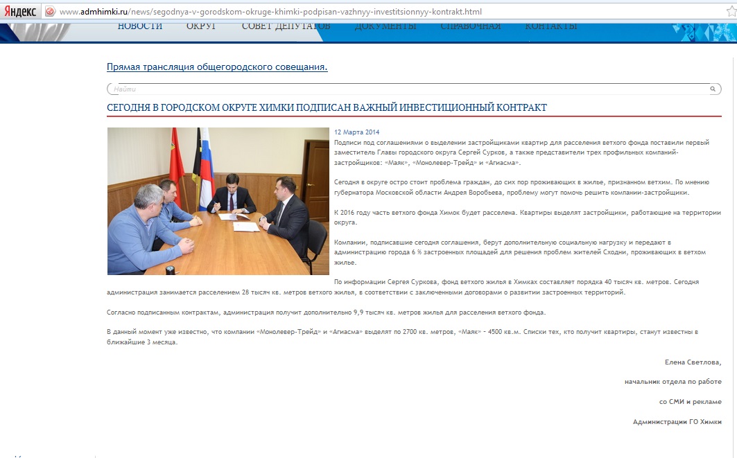 Итак, три скандальных застройки - ОАО "Маяк" на ул. Кудрявцева, компании "Агиасма" на ул. Марии Рубцовой и "Монолевер-Трейд" в районе Химкинской больницы - для протестующих против них жителей пытаются объяснить расселением ветхого фонда Сходни?