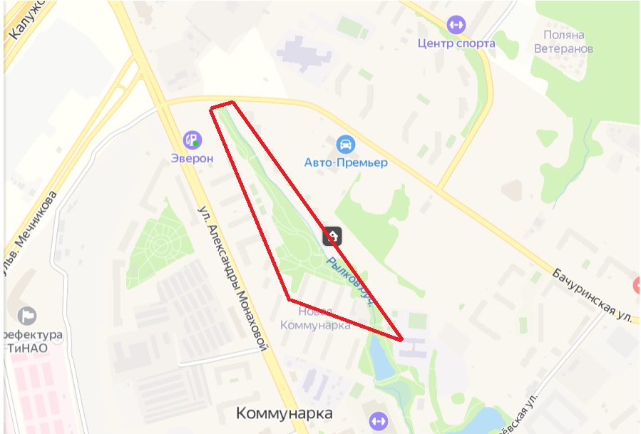Месторасположение Рылкова ручья и парка вдоль его берегов на карте: