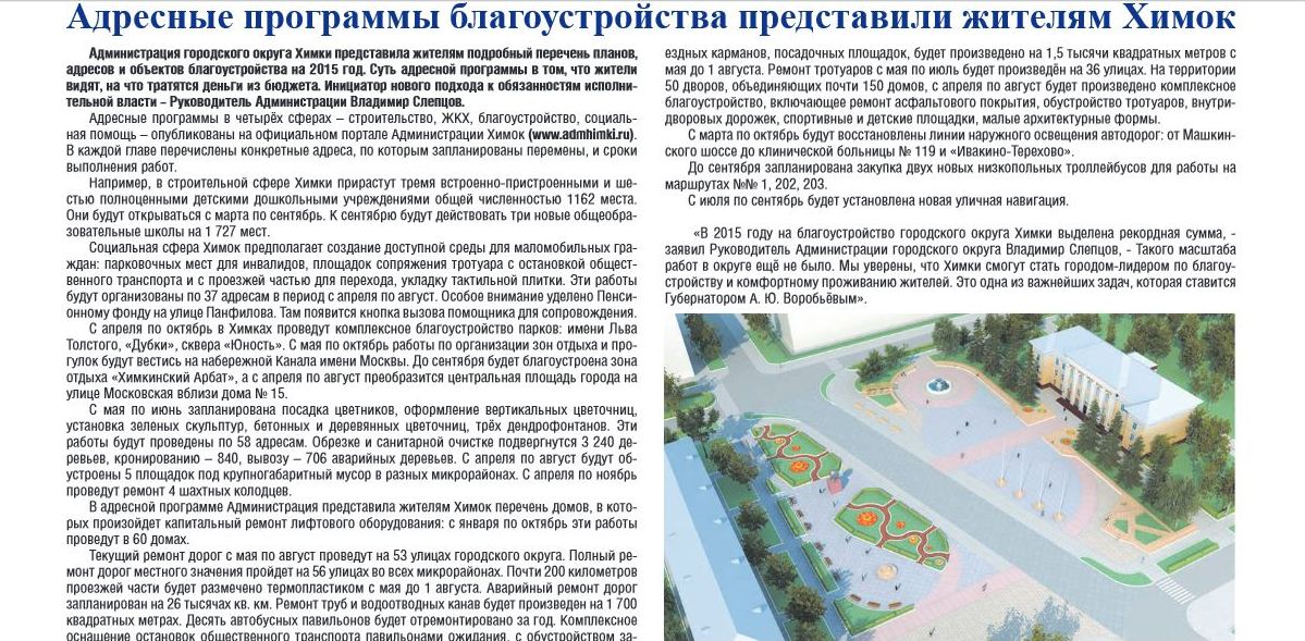 В "Химкинских новостях" опубликован перечень адресов, по которым в 2015 году будет производиться разнообразное "благоустройство". Так, будут построены школы, детсады, отремонтированы некоторые коммуникации и дороги, приведены в порядок лифты, мусорные контейнеры, остановки общественного транспорта. Работы по "благоустройству" затронут парки "Дубки" и им. Льва Толстого, а также сквер "Юность", набережную Канала им. Москвы. Кроме того, в Химках организуют пешеходные зоны, вырубят и кронируют деревья, создадут цветники, кое-где восстановят освещение, сделают спортивные и детские площадки и пр. Сумму затрат бюджета не называют, но она - "рекордная". Руководить процессом будет глава администрации Химок Владимир Слепцов.