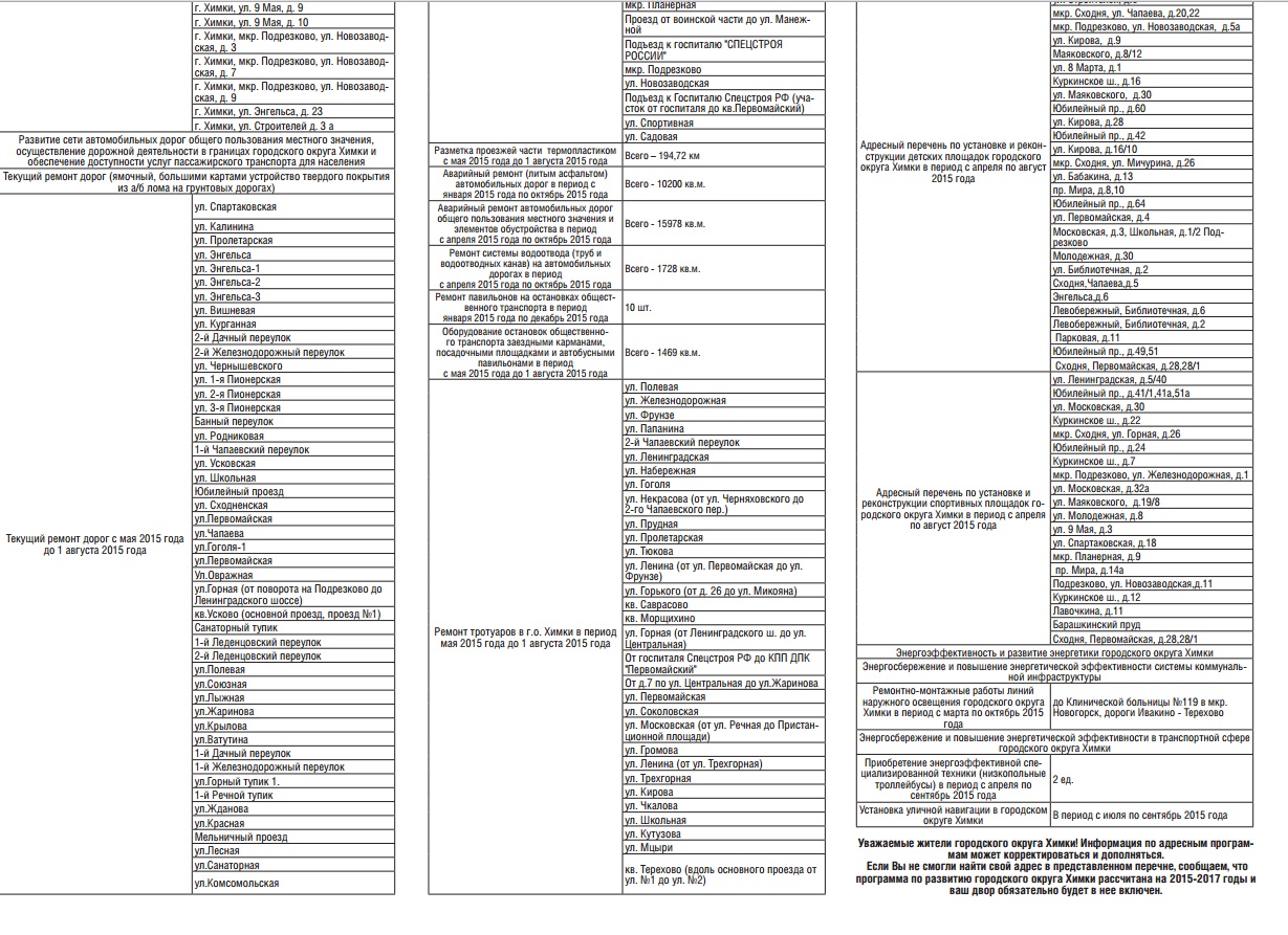 Перечень объектов, подлежащих "благоустройству" в Химках в 2015 году
