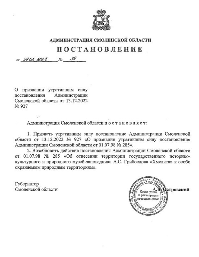 А уже вечером этого дня поступила радостная новость: губернатор Смоленской области Алексей Островский подписал постановление, которым восстановил "Хмелиту" в качестве ООПТ.