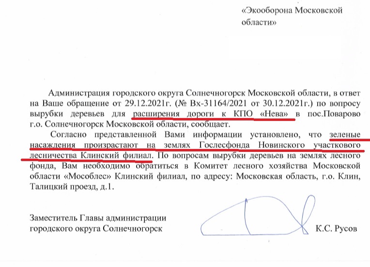 Администрация Солнечногорска подтвердила поступившую активистам информацию о том, что в ближайшее время в Поварово, вблизи "мусорного объекта" КПО "Нева", начнутся дополнительные рубки. Дорогу к полигону действительно будут расширять за счет леса, вырубив тысячи деревьев. Однако замглавы Солнечногорска Константин Русов "открестился" от этой ситуации и переадресовал вопрос о законности работ в лесхоз. Мол, земли, на которых планируют "развернуться" лесорубы, относятся к Гослесфонду, и муниципальные власти тут ни при чем.
