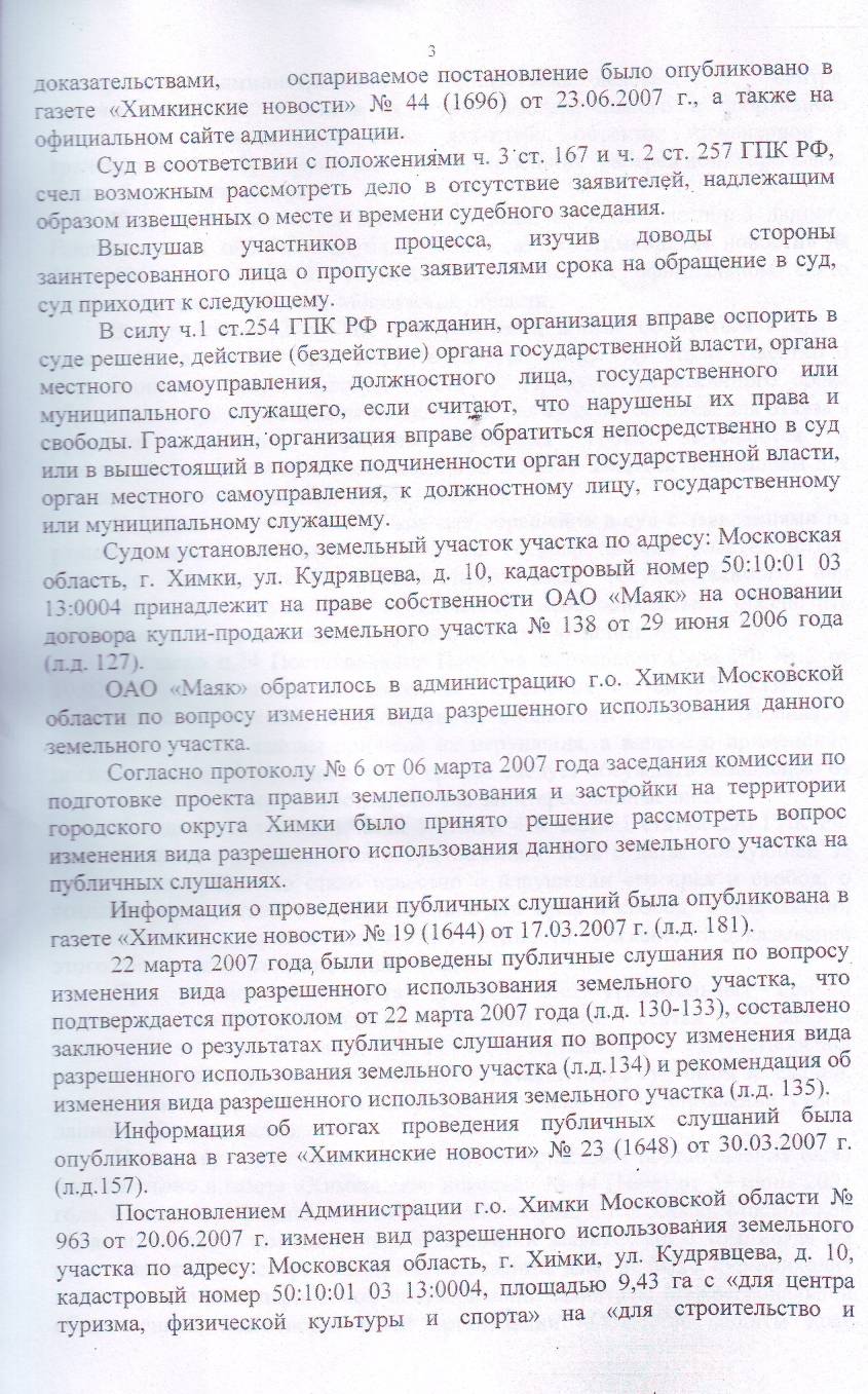 Вчера "Принципъ" получил мотивировочную часть решения суда на 5 листах. Оказалось, что возразить по сути иска абсолютно нечего. Отказ Мироновой признать незаконным постановление администрации Химок от 2007 года о переводе территории стадиона под жилую застройку произошел по чисто формальным причинам - якобы истцы пропустили срок исковой давности, который составляет 3 года. Вот решение суда: