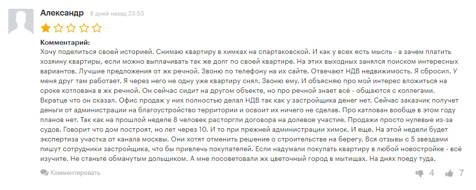Один из пользователей по имени Александр раскрывает эксклюзивную информацию, которую сообщил ему друг - сотрудник компании "НДВ-Недвижимость", связанной с застройщиком ЖК "Речной". Мол, продажи у проекта "просто нулевые из-за судов", а ведь еще скоро будет готова экспертиза от Канала им. Москвы, после которой выяснится, что застройка нарушает все что только возможно. При этом денег у застройщика нет, про котлован в ближайшее время и речи не идет, а немногие привлеченные дольщики расторгают договора. Все положительные отзывы о ЖК "Речной" в Интернете пишут сотрудники строительной компании, сообщает Александр.