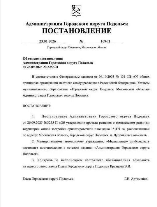 Подольские власти отменили проект застройки поселка Дубровицы, который ранее вызвал громкий общественный резонанс. Об этом сообщил местный депутат Алексей Старчак в соцсетях.