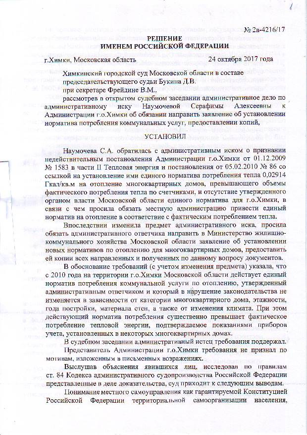 Как мы уже рассказывали, химкинским активистам удалось добиться решения суда о снижении платежей за отопление во всем городском округе. Судья Денис Букин посчитал убедительными аргументы истца - Серафимы Наумочевой, указавшей в своем иске, что из-за потепления климата потребление тепловой энергии в Химках снизилось более чем на 5% - на 7,5%. Из-за этого, согласно закону, нормативы отопления многоквартирных домов нуждаются в корректировке.
