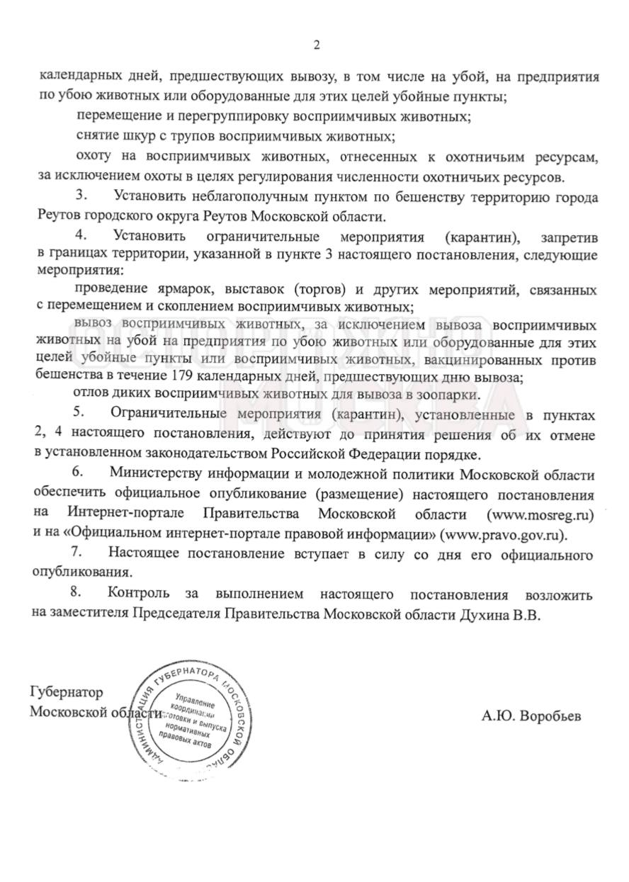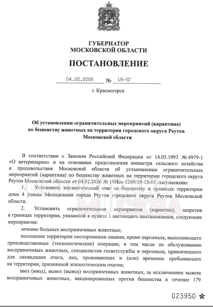 Подмосковные СМИ передают срочное сообщение - в городе Реутове объявлена опасность бешенства. Установлен карантин по этой инфекции по адресу: Реутов, ул. Молодежная, 4. На данной территории вводится ряд запретов, в частности ее запрещено посещать посторонним лицам, не проживающим по этому адресу и не являющимся персоналом, выполняющим технологические функции. Также нельзя лечить животных, которые восприимчивы к бешенству.
