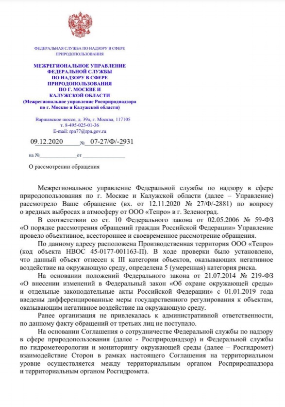 Из Росприроднадзора поступил ответ в связи с жалобами жителей на токсичные выбросы одного из предприятий Зеленограда. По мнению Николая Пажильцева, замруководителя Управления Росприророднадзора по Москве и Калужской области, "оснований для проведения внеплановой проверки не установлено". Дело в том, что, согласно справкам, представленным Росгидрометом, в октябре и ноябре на территории Зеленограда не были зарегистрированы загрязнения воздуха. Следовательно, проверка не требуется, делает вывод Пажильцев.