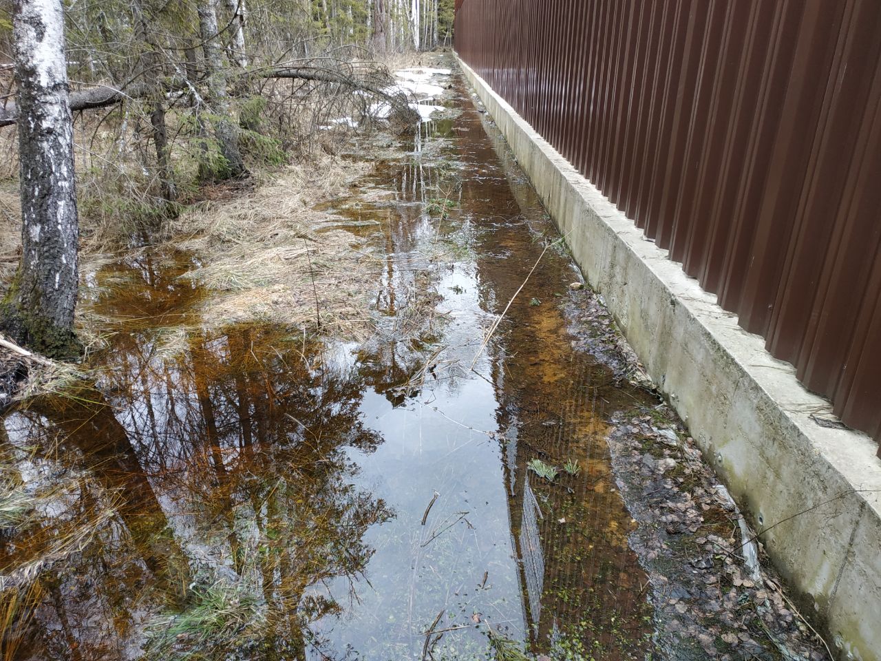 В юго-западной части мусорного полигона КПО "Нева" в Поварово из-под забора рекой льется талая вода. Местные экоактивисты зафиксировали этот поток.