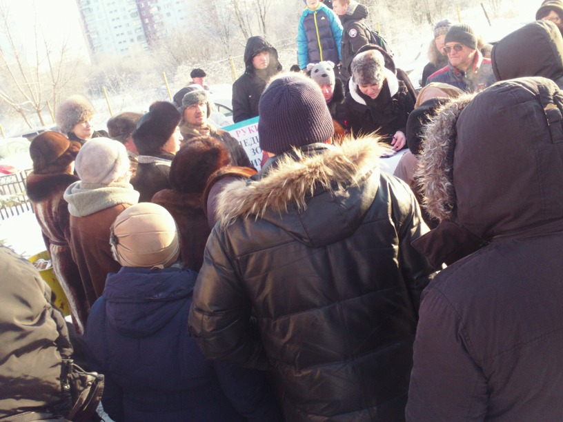 На сход в защиту сквера в 8-м микрорайоне Химок, несмотря на настоящие "крещенские морозы", пришли около 100 человек. Должностных лиц - ни из химкинской администрации, ни из правительства Московской области - в этот раз не было, зато были неравнодушные жители микрорайона, а также активисты Химсовета из 5-го, 7-го, 4-го микрорайонов, Старых Химок, Сходни и Фирсановки.