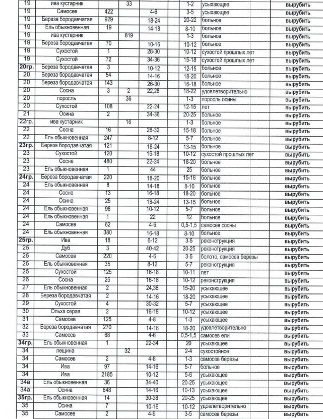 Приложена перечетная ведомость зеленых насаждений, где перечисляются разные виды деревьев, растущих на указанной территории, - с безжалостным вердиктом напротив каждого из них: "вырубить". Почти все деревья упомянуты как "усыхающие", "больные" либо "сухостой". В общем, согласно перечетной ведомости, весь лес, росший на данном участке, оказался никуда не годным.