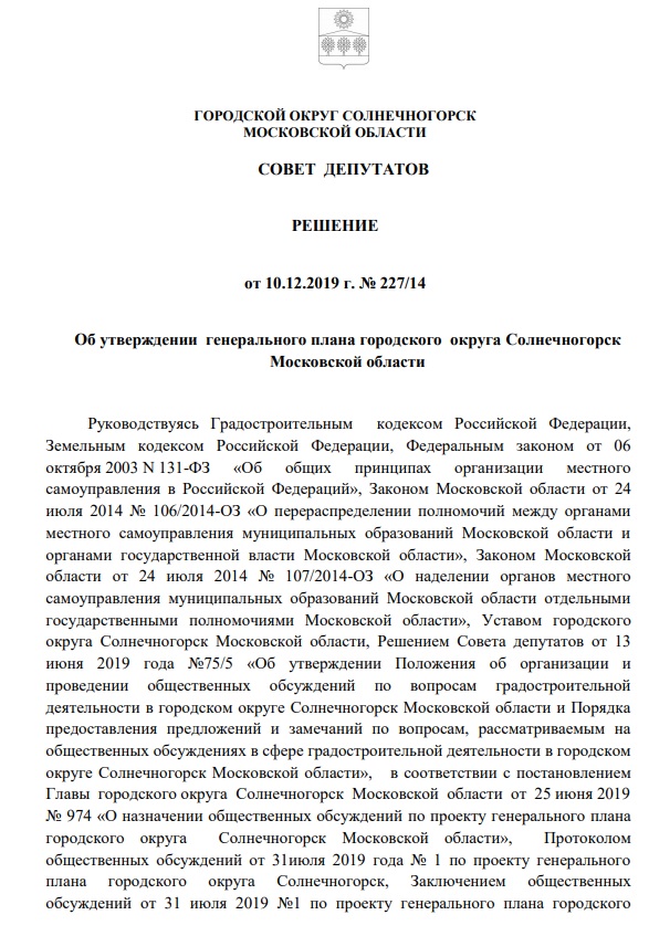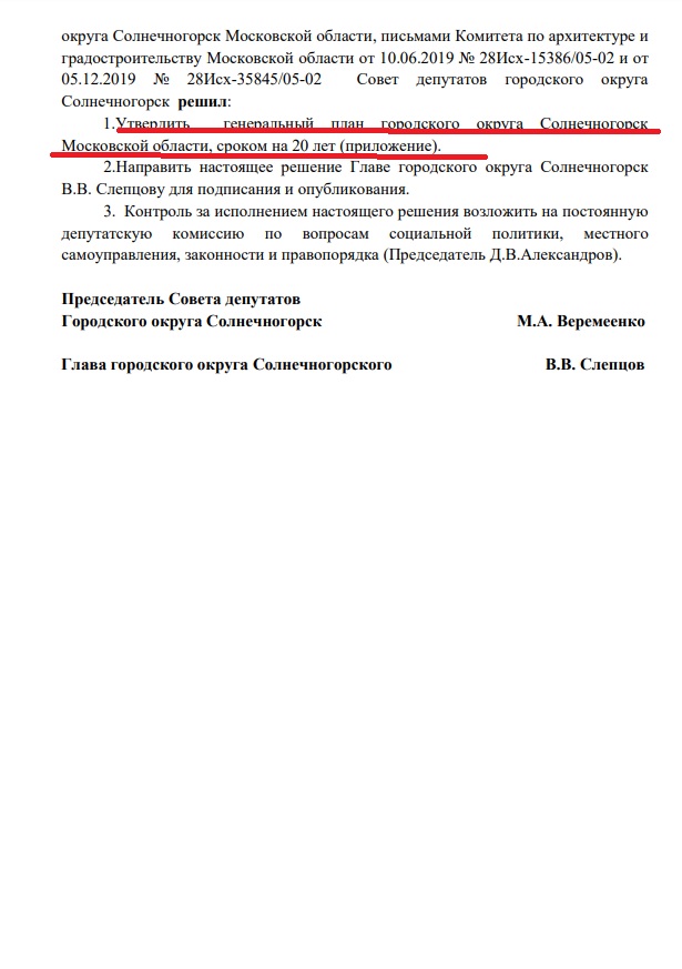 Решение об утверждении проекта Генплана и ПЗЗ за подписью главы Солнечногорска Владимира Слепцова и председателя совета депутатов Марины Веремеенко опубликовано на сайте администрации.