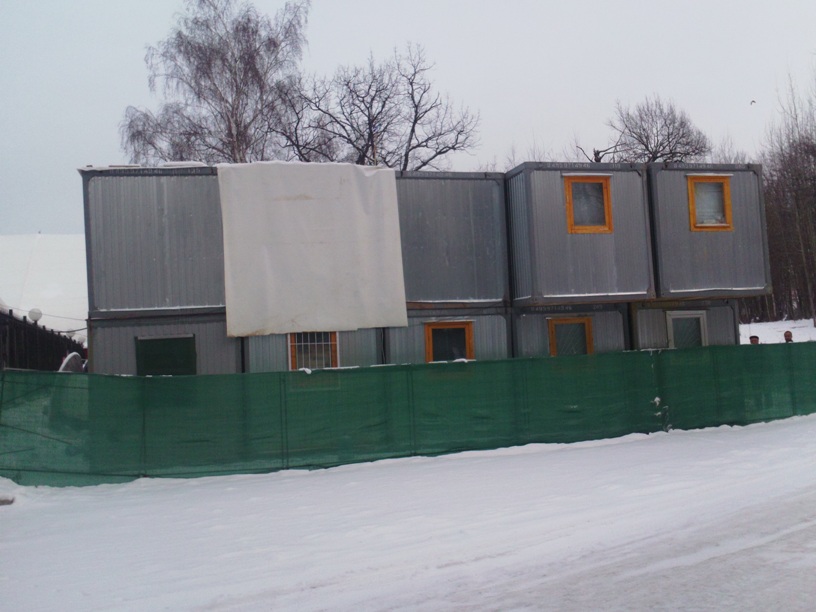 Стройка находится за зеленым забором, рядом с парковкой клуба "Космос", возле нее размещены бытовки.
