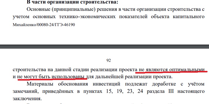 "Основные (принципиальные) решения в части организации строительства с учетом основных технико-экономических показателей объекта капитального строительства на данной стадии реализации проекта не являются оптимальными и не могут быть использованы для дальнейшей реализации проекта. Материалы обоснования инвестиций подлежат доработке с учётом замечаний..." - говорится, в частности, в экспертном заключении.