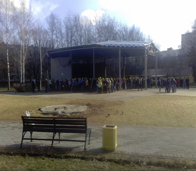 18 апреля в 9:00 в сходненском парке им. Величко (имеющем вполне благопристойный и ухоженный вид) собралось около 300 школьников с учителями. Играла громкая музыка, возле сцены выдавали грабли, перчатки, мешки для мусора... и кепки.