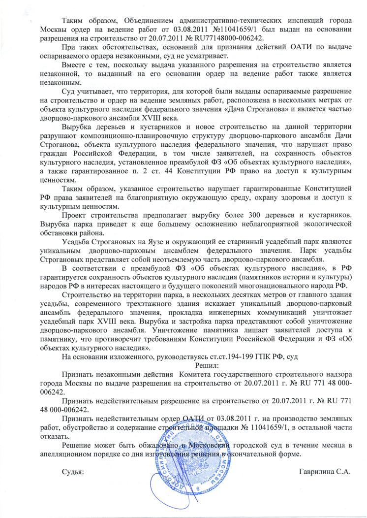 Суд выдал активистам решение о незаконности застройки Строгановского парка