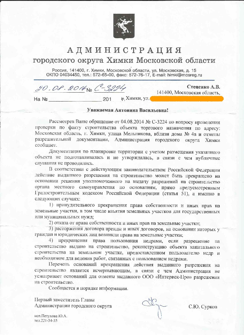 "Саморазоблачительное" письмо из администрации Химок получил Химсовет по поводу незаконного строительства магазина у дома 4А по проспекту Мельникова. Замглавы Сергей Сурков и не отрицает, что проект планировки территории не разрабатывался и не утверждался и что публичных слушаний по нему не было... но считает это недостаточным основанием для прекращения действия разрешения на строительство!
