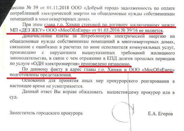 Химкинская городская прокуратура признала, что включение "долгов" 2016 года за общедомовые нужды (ОДН) в ЖКХ-счета жителей было незаконным. Зампрокурора г.о. Химки подготовил представления в адрес ООО "Мособлеирц" с целью устранить данное нарушение, то есть сделать перерасчет в пользу жителей.