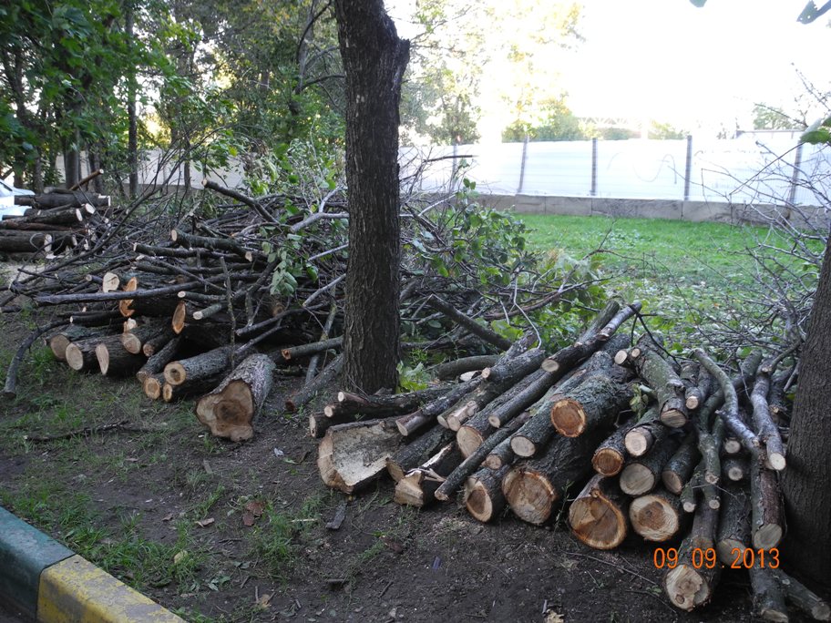 "Сегодня (9 сентября) пришла с работы и обнаружила около наших домов такую картину (см. фото). Вырубили порядка 20 деревьев и обрезали ветки с остальных. По слухам, завтра опять придут продолжать. Звонила в диспетчерскую ДЕЗ, там ничего не знают. Пришлось обратиться к оперативному дежурному администрации. Он звонил также в ДЕЗ, ему там тоже ничего прокомментировать не смогли; выяснял контакты начальника и т. д. В итоге озвучил версию якобы главного инженера, что это Комбинат по благоустройству и озеленению кронирует деревья и получил разрешение у начальства 1-го участка ДЕЗ на вырубку 2 аварийных деревьев. При этом вырублено не 2, а 20, и совсем не сухостой, а очень даже здоровые деревья!"