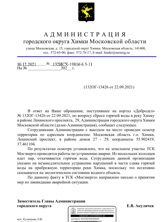 С большим опозданием - спустя почти три месяца - администрация г.о. Химки наконец ответила на запрос "Экообороны", касающийся слива горячей воды в речку Химку в районе Ленинского проспекта. В документе за подписью замглавы Химок Евгения Акуличева говорится, что по резутатам проверки установлена причина сбросов - авария на теплосети. ТСК "Мосэнерго" обязали устранить нарушения, которые негативно сказываются на состоянии реки.