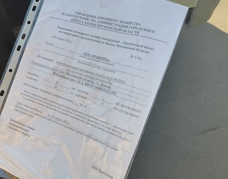 Жители потребовали у рабочих порубочный билет. После предоставления документа выяснилось, что работы по согласованию с заместителем главы г.о. Химки Дмитрием Чистяковым ведет некое ООО "Фабрика". При этом вырубке подлежат 24 дерева и 9 кустарников. Цель работ неизвестна - по словам жителей, пытавшихся прояснить этот вопрос, "подрядчик не в курсе".