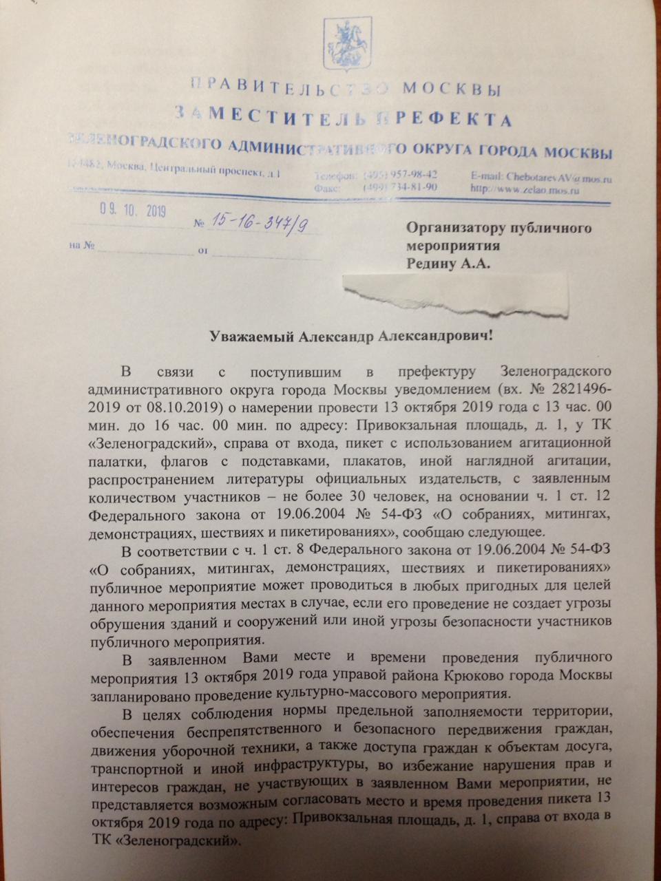 Публикуем ответ заместителя префекта Александра Чеботарева заявителям пикета:
