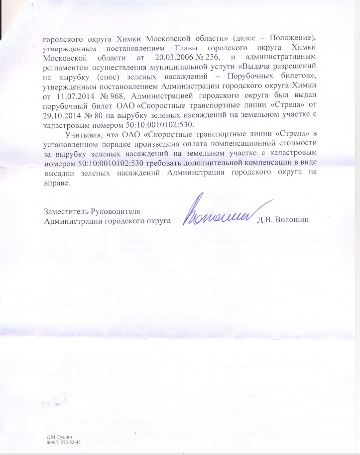 Таким образом, получается, "версия" изменилась. Временно расположенная "не на своем месте" автостоянка, о которой ранее сообщал Вячеслав Нырков, превратилась в часть транспортной инфраструктуры линии "Стрела", для которой предназначен участок. Однако и в этом случае для строительства требуются разрешение на строительство, градостроительный план земельного участка и прочие документы, которые отсутствуют, признает Волошин... но почему-то далее выводов не делает. Похоже, главное, что за вырубку зеленых насаждений застройщиком внесена компенсационная стоимость.