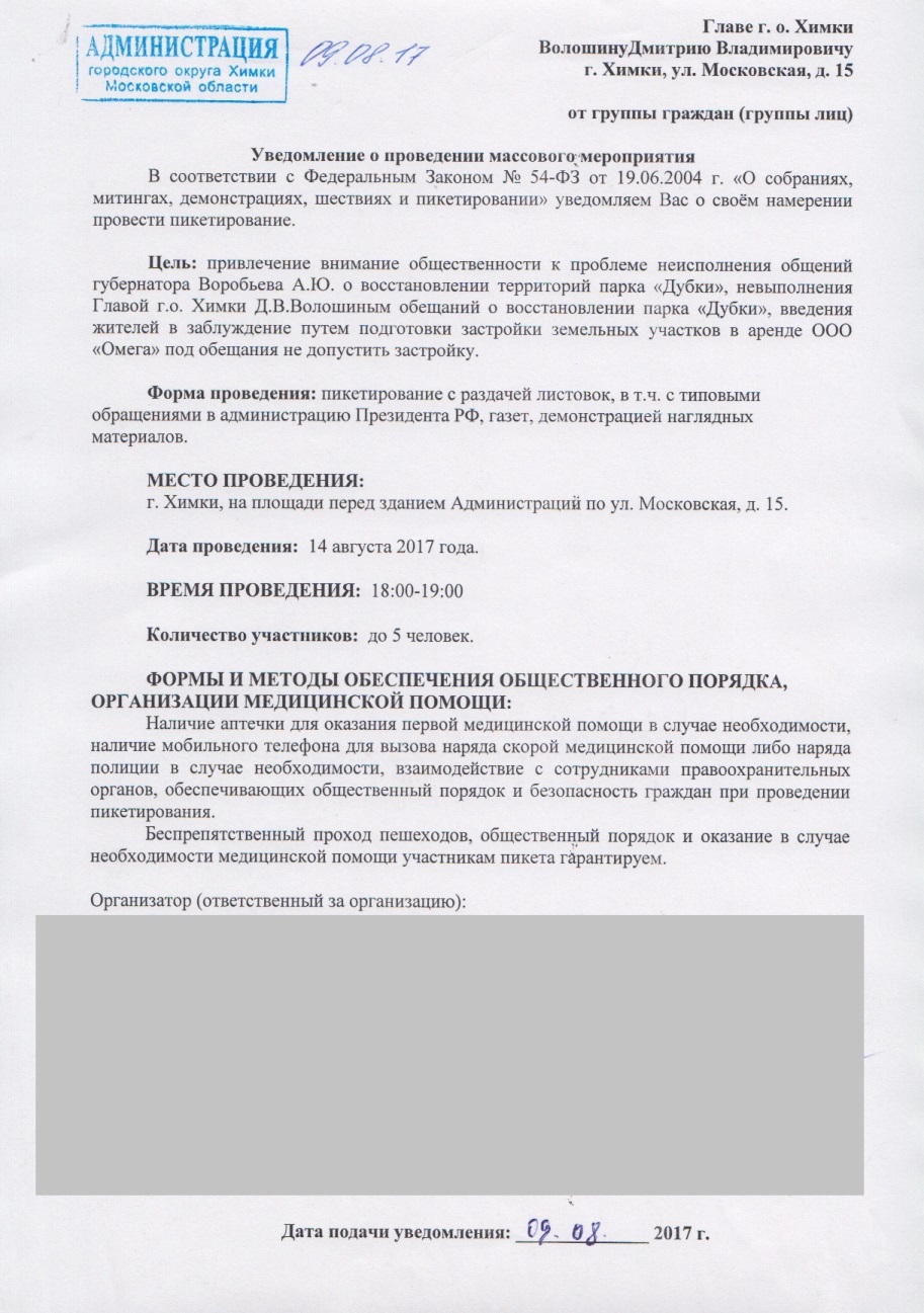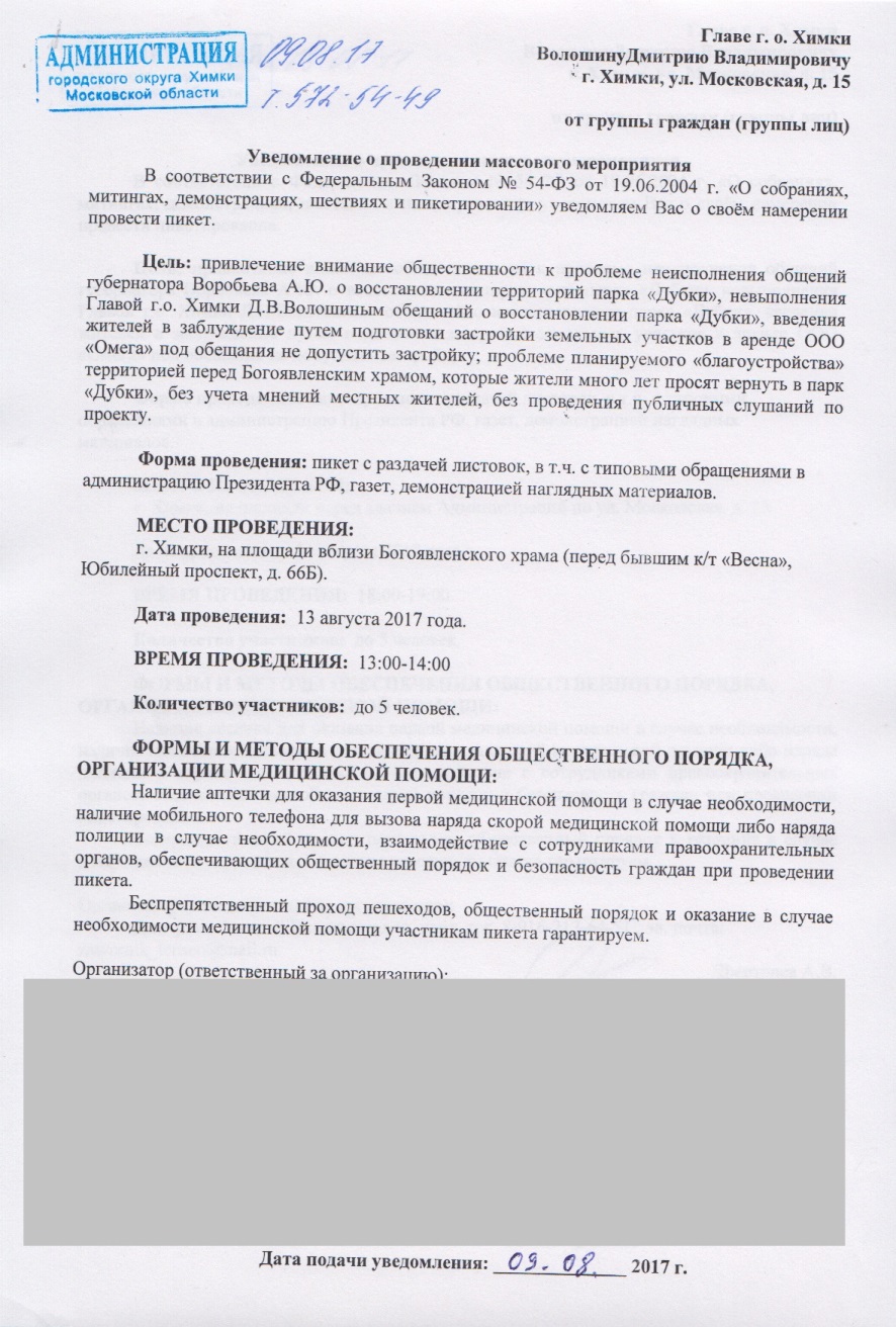 Защитники парка "Дубки" подали две заявки на проведение пикетирования в г.о. Химки. Предполагается, что пикеты пройдут в воскресенье и понедельник, 13 и 14 августа, около Богоявленского храма (вблизи "Дубков") и рядом с администрацией г.о. Химки, на ул. Московской.
