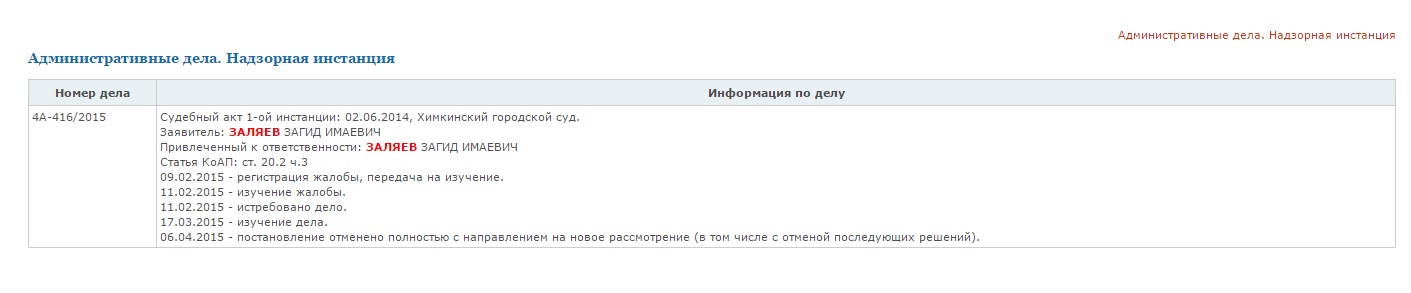 Вот какая информация размещена на сайте Мособлсуда о рассмотрении надзорной жалобы Заляева: