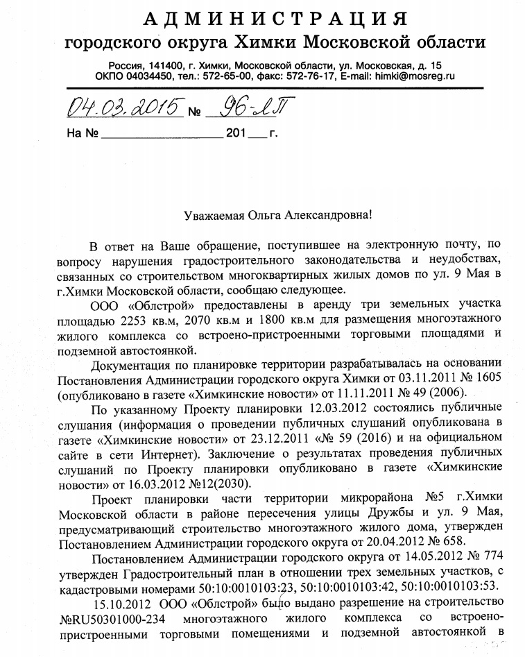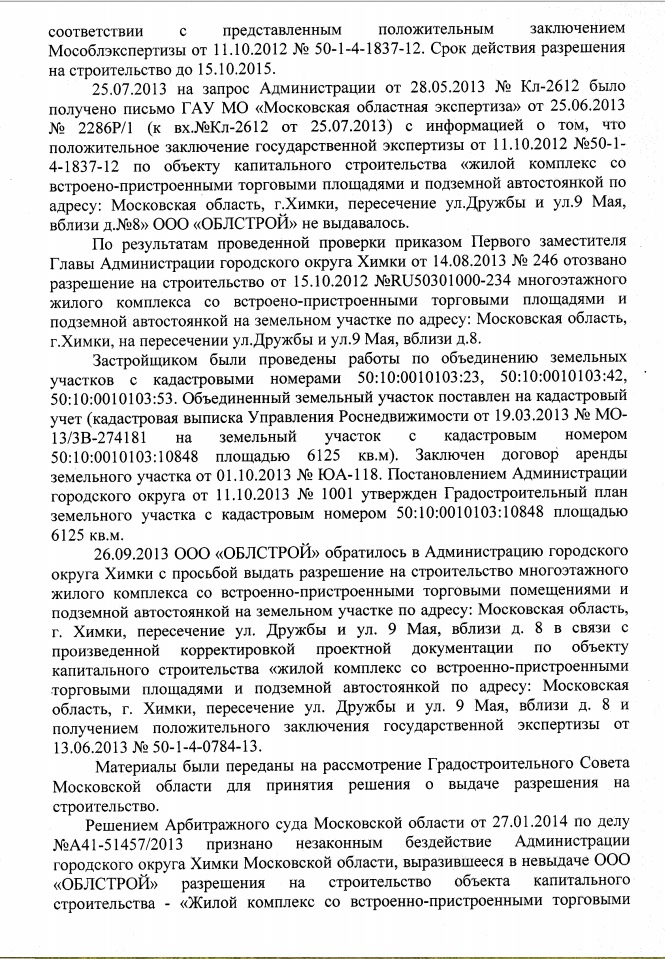 В связи с тем что при подготовке и утверждении исходно-разрешительной документации ООО "ОБЛСТРОЙ" и ООО "Химкинское СМУ МОИС-1" нарушены градостроительные нормативы, продолжение строительства еще четырех домов повышенной этажности, не обеспеченных парковочными местами и социальной инфраструктурой, приведет к дальнейшему усугублению уже существующих проблем.