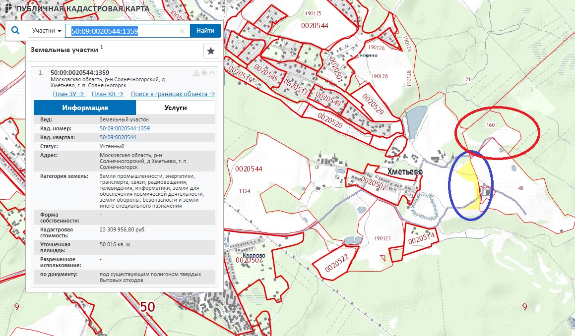 В синем кружке - участок, о котором идет речь в данной публикации, в красном - тот, который передан под строительство МСЗ