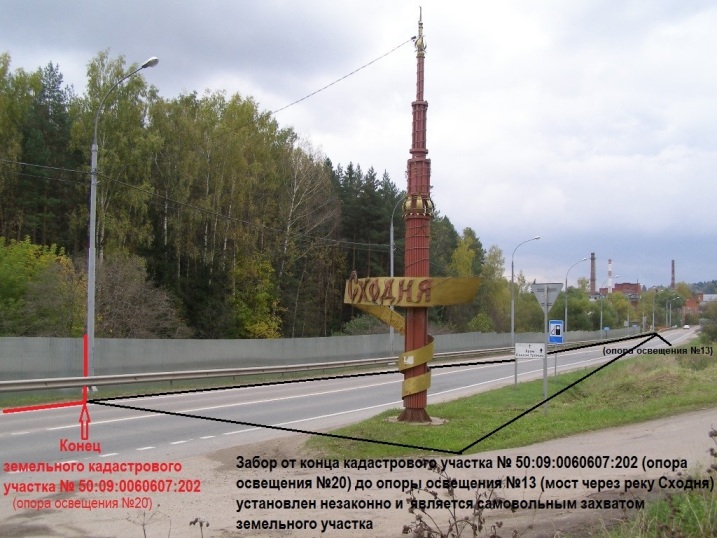 Начало границы земельного участка с кадастровым номером 50:09:0060607:202, проходящей вдоль ул. Первомайская, находится около опоры освещения № 26. Забор от начала границы земельного участка с кадастровым номером 50:09:0060607:202 (опора освещения № 26) до опоры освещения № 30 и от конца участка (опора освещения № 20) до опоры освещения № 13 (мост через реку Сходня) установлен незаконно и является самовольным захватом земельного участка.