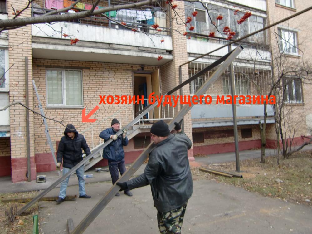 16 ноября представитель малого бизнеса по имени Якуб решил в квартире на первом этаже открыть магазин и прихватил придомовую территорию. Начал устанавливать столбы на газоне, повредил отмостку, вбил штыри в стену и к ним приварил столбы. Решил за счет общей придомовой территории увеличить свой магазин.