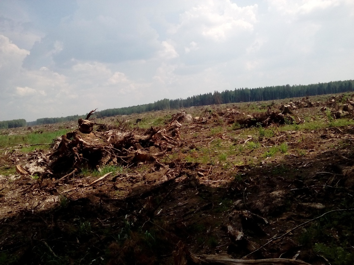 Работы на вырубке в последнее время практически не ведутся, покуда хватает глаз - выкорчеванные пни, а также стволы берез и елей (при этом пригодные для изготовления пиломатериалов сосны вывезены).