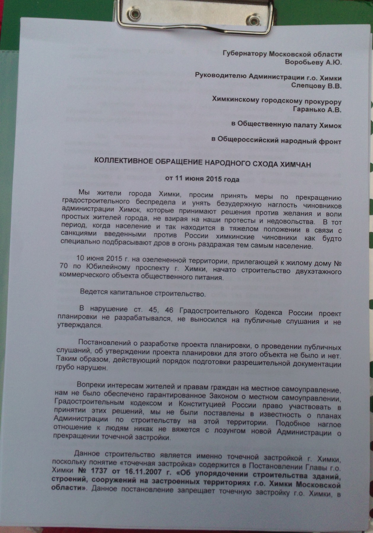 Жители подписали коллективное заявление в требованием прекратить строительство к химкинской администрации, в Общественную палату Химок, к губернатору Московской области, в Общероссийский народный фронт и прокуратуру.