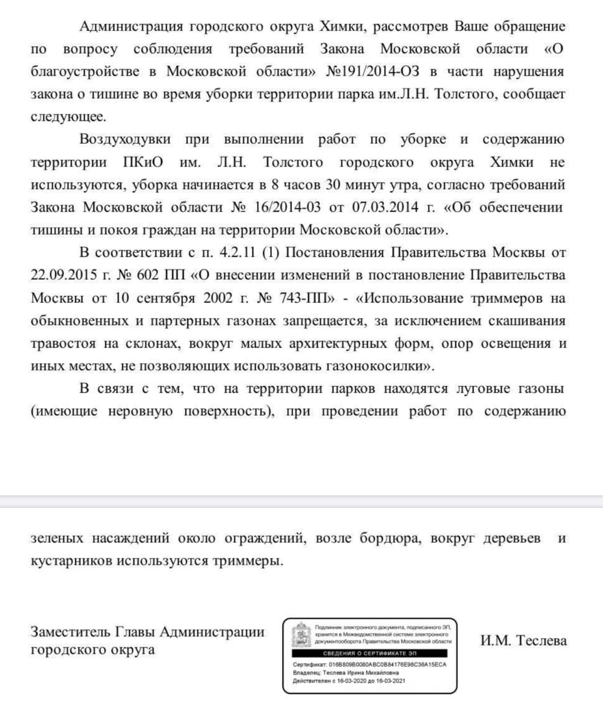 На обращение жителей в администрацию ответила замглавы Химок Ирина Теслева - она сообщила, что воздуходувки не используются при уходе за парками.