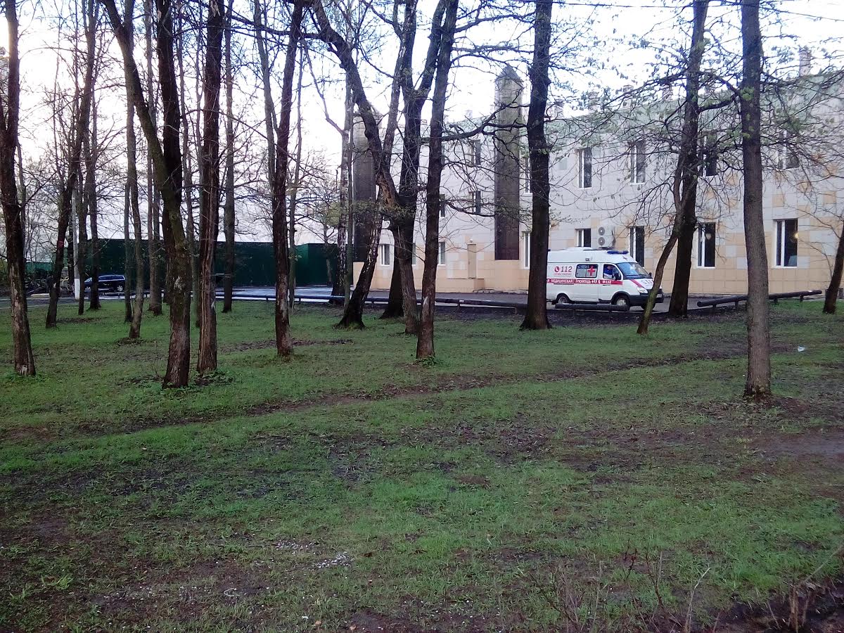 На парковке находится лишь одинокая машина скорой помощи (которую, видимо, пропустили в качестве исключения).